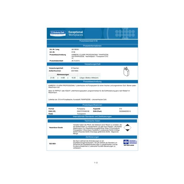 Kimberly-Clark Lufterfrischung 6136 Duftspray/Nachfüller. • Duft: Zitrone • Inhalt: 310ml Duftflasche • Bedienung: Autonom einsetzbar