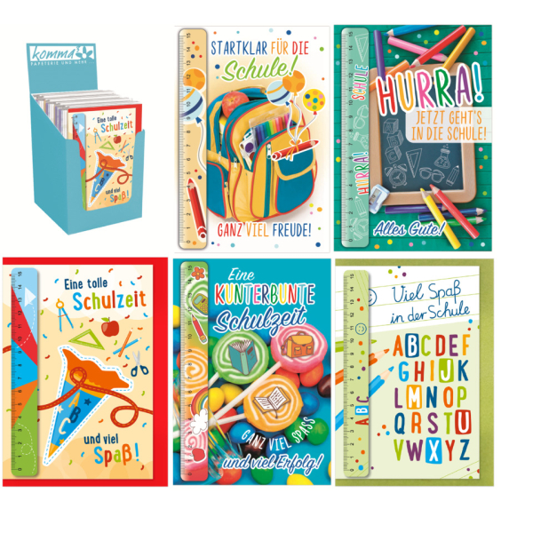Entdecken Sie die farbenfrohen Glückwunschkarten 72061158 von Komma, die perfekt zum Schulanfang geeignet sind! Diese einzigartigen Karten sind mit einem praktischen Lineal ausgestattet und kommen in verschiedenen, liebevoll gestalteten Motiven, die die Vorfreude auf den ersten Schultag noch steigern.