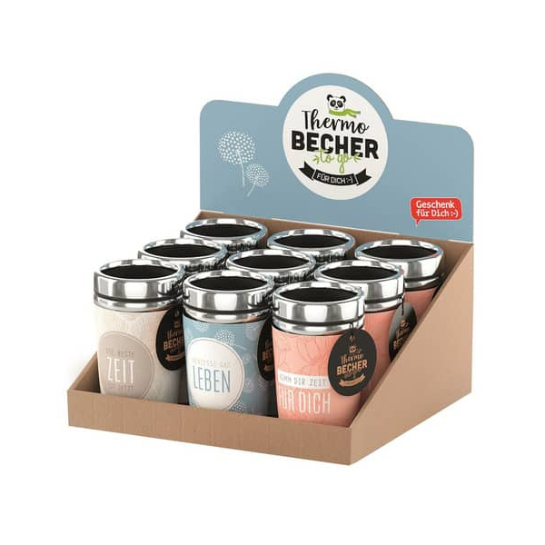 Der Thermobecher to go Relax sortiert von FÜR DICH ist der perfekte Begleiter für unterwegs. Mit einem Fassungsvermögen von 240ml hält er deine Getränke lange warm oder kalt.