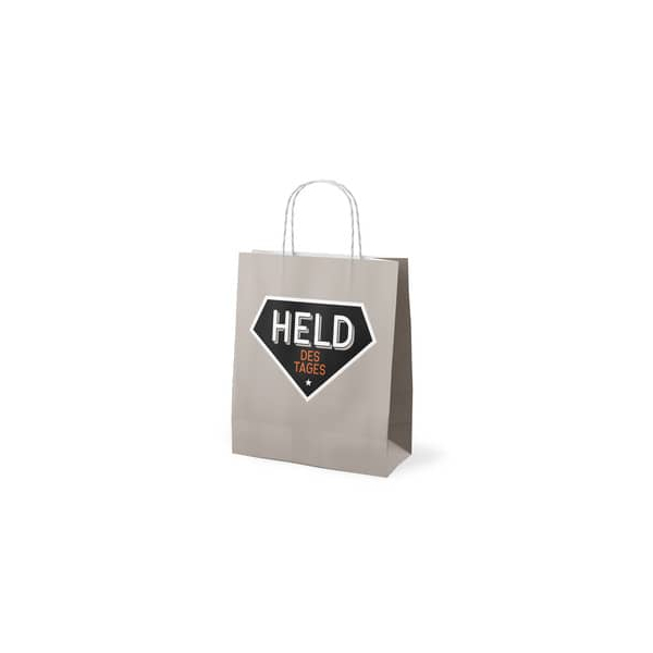 Die Geschenktasche besticht durch ihr ansprechendes Design mit dem Motiv HELD DES TAGES und setzt so Ihre Geschenke gekonnt in Szene. Die gedrehte Papierkordel sorgt für einen eleganten Look und ermöglicht ein einfaches Tragen.