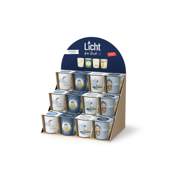 Der Teelichthalter „Grüße vom Meer“ hat eine Größe von Ø 57 × 65 mm. Er besteht aus Glas und ist mit einer Papierbanderole versehen. Der Teelichthalter wird inklusive Teelicht geliefert und ist in vier verschiedenen Motiven sortiert im Display erhältlich.