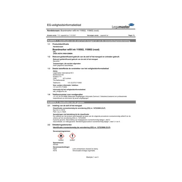 Legamaster International B.V., Kwinkweerd 62, Postbus 111, 7240 AC Lochem, Netherlands, Telefon-Nr.: +31 (0) 573-713000, Email: sdb_info@umco.de