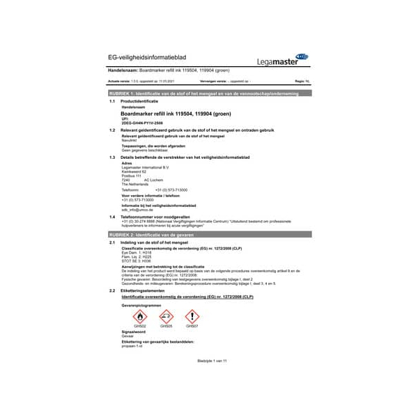 Legamaster International B.V., Kwinkweerd 62, Postbus 111, 7240 AC Lochem, Netherlands, Telefon-Nr.: +31 (0) 573-713000, Email: sdb_info@umco.de