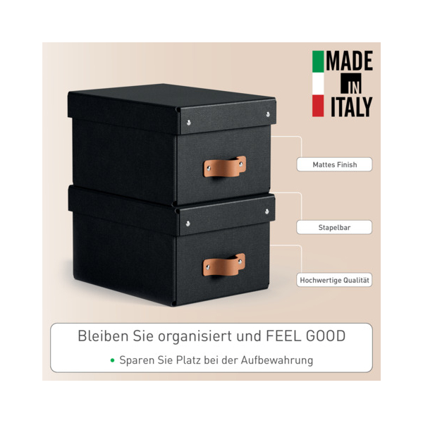 Mit einem Fassungsvermögen von 7 Litern bietet diese Archivbox genügend Platz für Ihre Dokumente. Der schnelle und einfache Aufbau erfolgt ganz ohne Werkzeug, sodass Sie sofort mit der Organisation beginnen können. Der Griff aus recyceltem Leder sorgt für eine stilvolle und nachhaltige Handhabung.