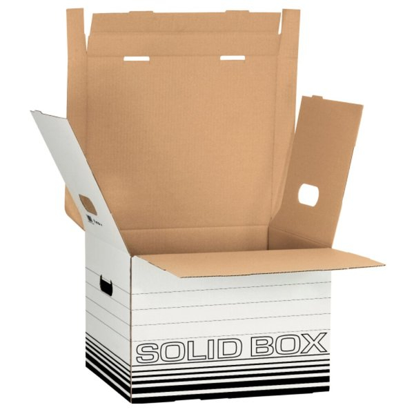 Die Solid-Archivboxen sind in verschiedenen Größen erhältlich und verfügen über einen Automatikboden, der Ihnen den Aufbau der Box erleichtert. Dank der doppelten Böden und Wände bietet die Box auch bei schwerer Beladung Stabilität. Der integrierte Klappdeckel sorgt dafür, dass Ihre Unterlagen sicher aufbewahrt sind.