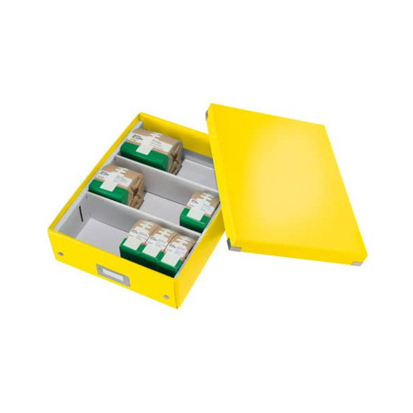 Leitz Click & Store WOW 6058-00-16 Aufbewahrungsbox in gelb • Material: Karton • Volumen: 8 Liter • Verschlussart: mit Deckel • Innenmaß: 335 x 265 x 90mm • Außenmaß: 370 x 281 x 100mm • max. Tragfähigkeit: bis 6kg • stapelbar • z. B. für: A4 • Eignung: Haushalt, Büro