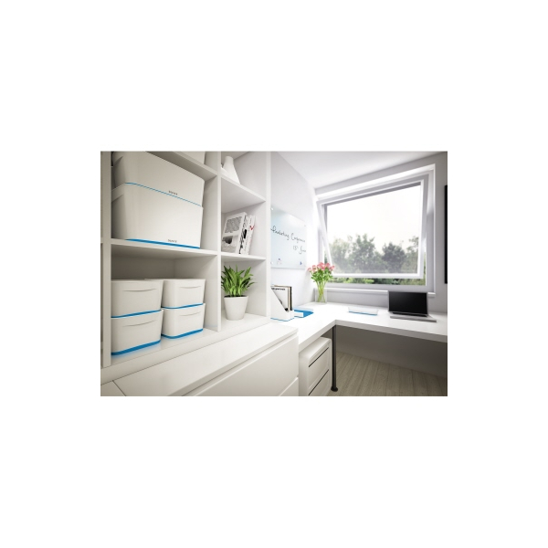 Leitz MyBox 5229-10-36 Aufbewahrungsbox in weiß/blau • Material: Kunststoff • Volumen: 5 Liter • Verschlussart: mit Deckel • Innenmaß: 258 x 128 x 123mm • Außenmaß: 318 x 191 x 128mm • max. Tragfähigkeit: bis 5kg • stapelbar • z. B. für: A5 • Eignung: Haushalt, Büro, Werkstatt