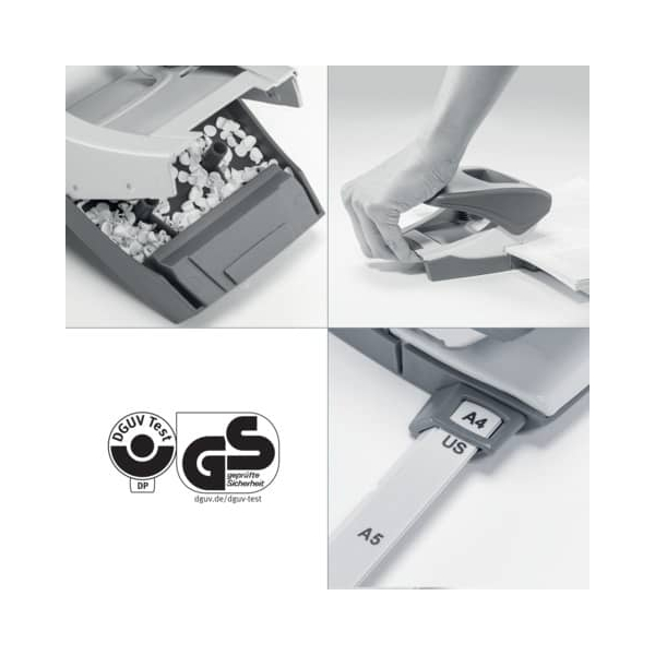 | Anschlagschiene mit farbiger Bedruckung und Fenster, mit transprarentem, rutschfestem Kunststoffboden (Abfallkasten), mit patentierter Griffmulde und ultra-scharfen Lochstempeln, auch für 4-fach Lochung geeignet | |