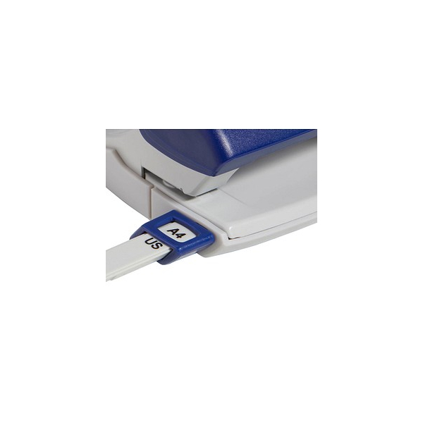 Anschlagschiene mit farbiger Bedruckung und Fenster. Mit transprarentem, rutschfestem Kunststoffboden (Abfallkasten), ergonomisch geformter Griffbereich, mit ultra-scharfen Lochstempeln, auch für 4-fach Lochung geeignet