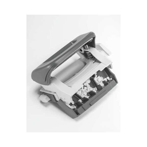 Anschlagschiene mit farbiger Bedruckung und Fenster. Mit transprarentem, rutschfestem Kunststoffboden (Abfallkasten), ergonomisch geformter Griffbereich, mit ultra-scharfen Lochstempeln, auch für 4-fach Lochung geeignet