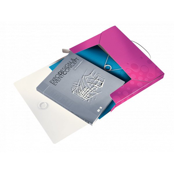Dank des Gummizugverschlusses bleibt der Inhalt sicher verstaut, während das Rückenschild eine einfache Beschriftung ermöglicht. Die Heftbox ist in einem trendigen pink metallic erhältlich und besticht durch das stylische WOW-Motiv.