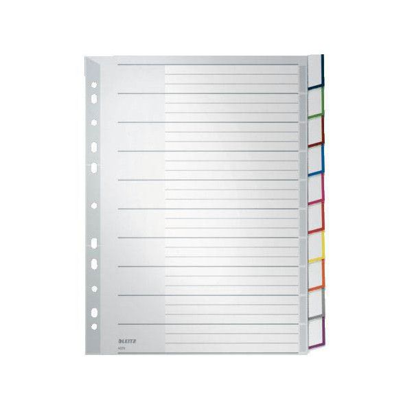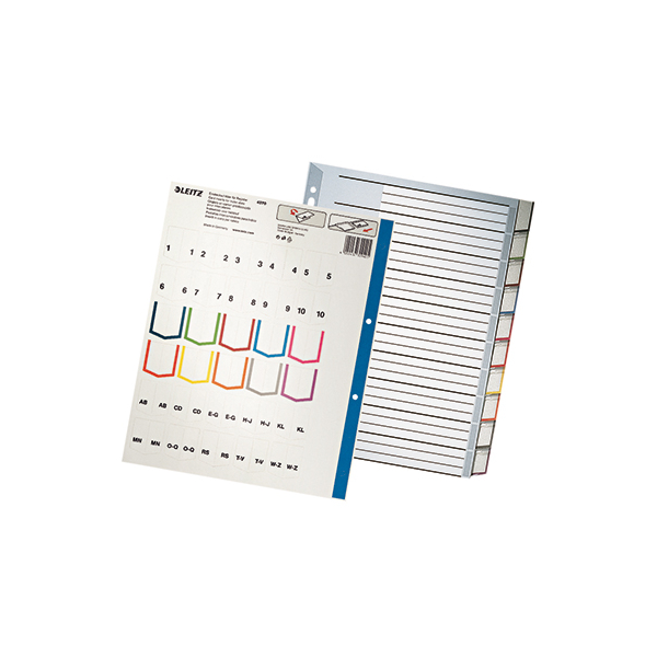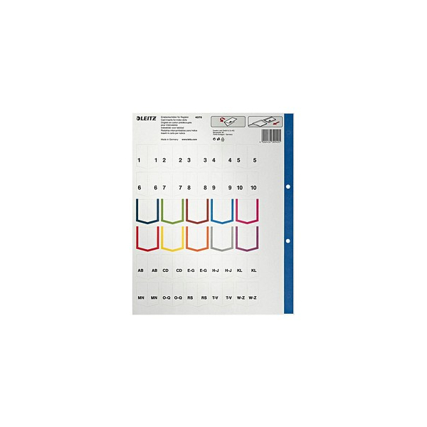 Leitz 4370-00-00 Wechseltabenregister in A4+. • Tabenfarbe: farbige Fenstertaben • Registerteilung: 10-teilig blanko • Lochung: Universallochung • mit beschriftbaren Deckblatt