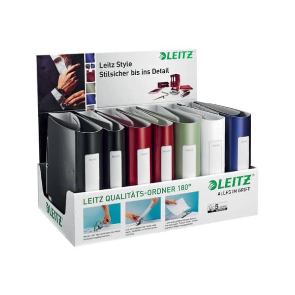 Leitz Active Style 9413-00-00 Ordner • Format: A4 • Farbe: farbig sortiert vollfarbig, Alu-Optik • Rückenbreite: 60mm (7x), 80mm (8x) schmal, breit für 350 Blatt, 500 Blatt • Material: Kunststoff • Zertifikat: GS geprüft • Ringmechanik: 180°-Präzisionshebelmechanik • mit Griffloch • ohne Kantenschutz