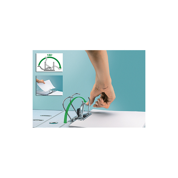Dank der patentierten 180º-Präzisionsmechanik bietet er eine 50 % größere Mechaniköffnung und ermöglicht somit ein 20 % schnelleres Abheften. Zusätzlich können Sie Ihre Unterlagen auch auf der linken Seite bequem ablegen. Der Ordner ist mit drei Innentaschen am Vorderdeckel ausgestattet, ideal für lose Papiere, CDs oder andere Utensilien, und verfügt über eine praktische Stiftelasche.