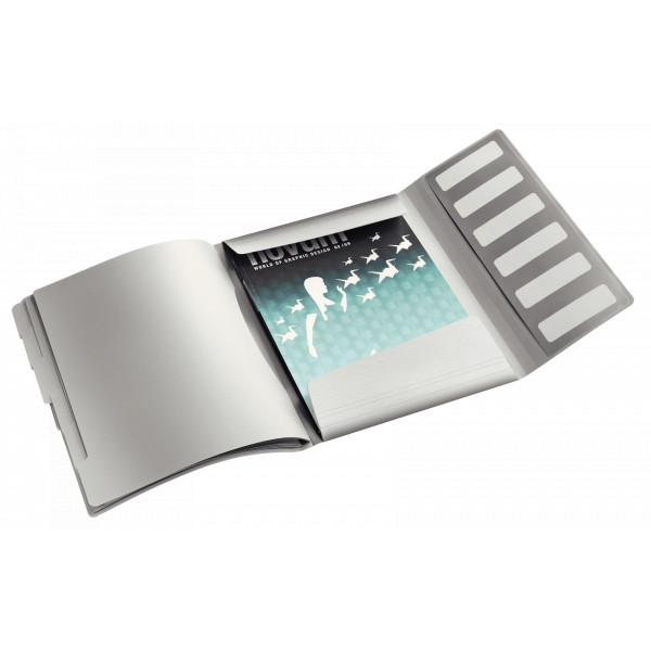 mit 12 Beschrifungsschildchen auf dem Vorderdeckel, mit Inhaltsverzeichnis und drei Schutzklappen für lose Dokumente, edelstahlbeschichteter Verschluß, soft gebürstete Oberfläche