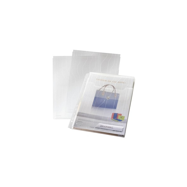 Die praktische Ausführung mit einer einklappbaren Klappe und einem Lochrand ermöglicht es, die Hüllen flexibel im Ordner zu verwenden oder sie auf dem Schreibtisch zu stapeln. Zudem haben die Hüllen eine Dehnfalte, die Platz für voluminöse Dokumente und Kataloge bis zu 150 Blatt (80 g/m²) bietet.