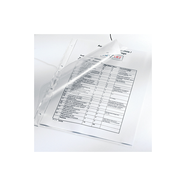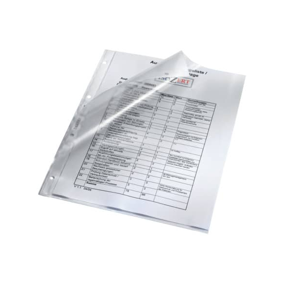 Die Prospekthüllen sind oben und links offen und verfügen über eine praktische 4-fach Lochung, die das Abheften in Ordnern erleichtert. Das robuste Material aus recycelbarem Polypropylen (PP) hat eine Stärke von 0,12 mm und sorgt für eine lange Lebensdauer und Stabilität.