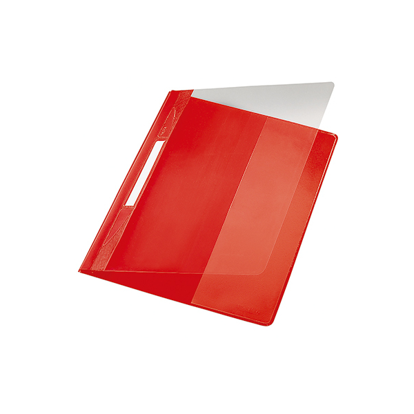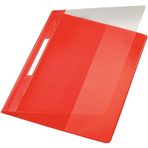 Leitz Exquisit 4194-00-25 Schnellhefter • Format: DIN A4+ • Farbe: rot • Vorderdeckel: transparent (= Sichthefter) • mit Beschriftungsfeld • Material: Polyvinylchlorid (PVC) 80 g/m² • Heftung: 1 x kaufmännische Heftung • Fassungsvermögen ca.: 250 Blatt