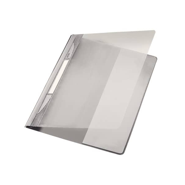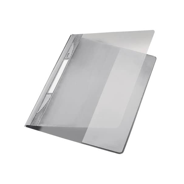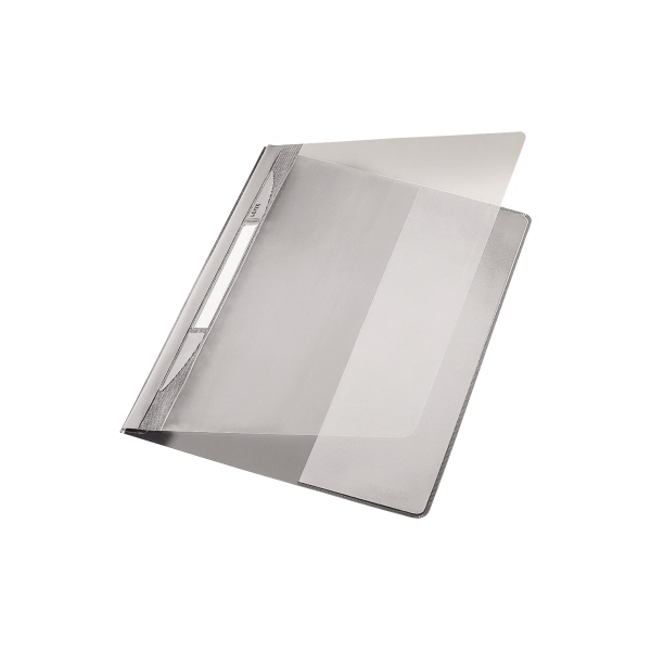 Leitz Exquisit 41940085 Schnellhefter • Format: DIN A4+ • Farbe: grau • Vorderdeckel: transparent (= Sichthefter) • mit Beschriftungsfeld • Material: Polyvinylchlorid (PVC) 80 g/m² • Heftung: 1 x kaufmännische Heftung • Fassungsvermögen ca.: 250 Blatt