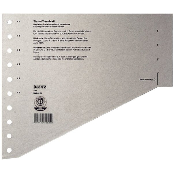 Die Staffel-Trennblätter von Leitz aus der Serie 1651 bieten Ihnen eine praktische und flexible Lösung zur Organisation Ihrer Dokumente. Durch die gestaffelte Anordnung können Sie Register mit 3, 4, 6 oder 11 Blatt bilden. Zudem sind die Trennblätter durch das zusätzliche Ausschneiden von vier Taben auf insgesamt 15 Blatt erweiterbar. Eine Gebrauchsanweisung ist auf jedem Blatt aufgedruckt, um Ihnen die Handhabung zu erleichtern.