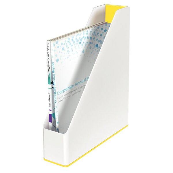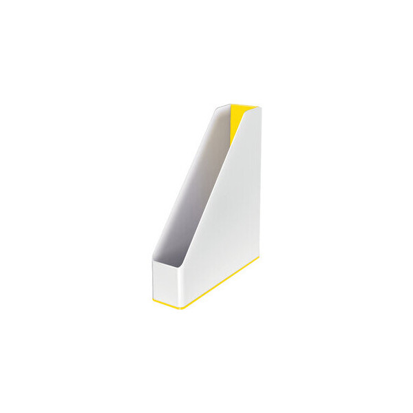 Entdecken Sie den Stehsammler WOW Duo Colour 5362-10-16 von Leitz, der in einem auffälligen gelb/weiß Farbdesign gehalten ist. Dieser hochwertige Zeitschriftenhalter beeindruckt durch seinen modernen und zweifarbigen WOW Effekt in Hochglanz, der Ihrem Arbeitsplatz einen frischen und ansprechenden Look verleiht.