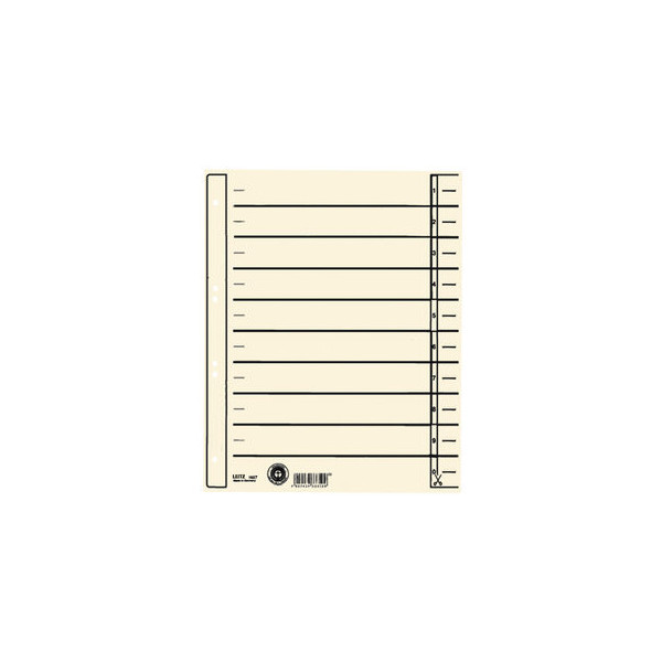 Leitz 1657-00-11 Trennblätter in chamois. • Format: A4 • Grammatur: 200 g/m² • 6-fach-Lochung • Tabeneigenschaften: chamoise Taben zum ausschneiden • Lochung hinterklebt • Zertifikate: Blauer Engel