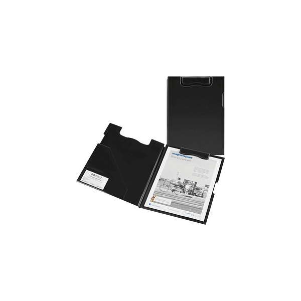 Die Klemmbrettmappe ist stabil, leicht und mit abwaschbarem Kunststoff bezogen. Sie verfügt über eine transparente Einstecktasche für weitere Unterlagen, und die integrierten Magnete halten bis zu 15 Blatt Papier. Das Auswechseln der Papiere erfolgt in Sekunden, und zudem haften sie an allen eisenhaltigen Wänden und Oberflächen wie Schreibtafeln und Metallschränken, wo sie als praktische Schreibauflage genutzt werden können. Die Maße betragen 230 x 320 mm.