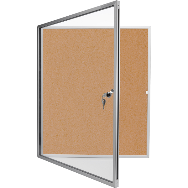 Die Kombination aus braunem Kork und silbernem Aluminiumrahmen verleiht dem Schaukasten eine stilvolle Optik, die in jede Umgebung passt. Die praktische Flügeltür mit einem Zylinderschloss sorgt dafür, dass Ihre Inhalte sicher aufbewahrt werden.