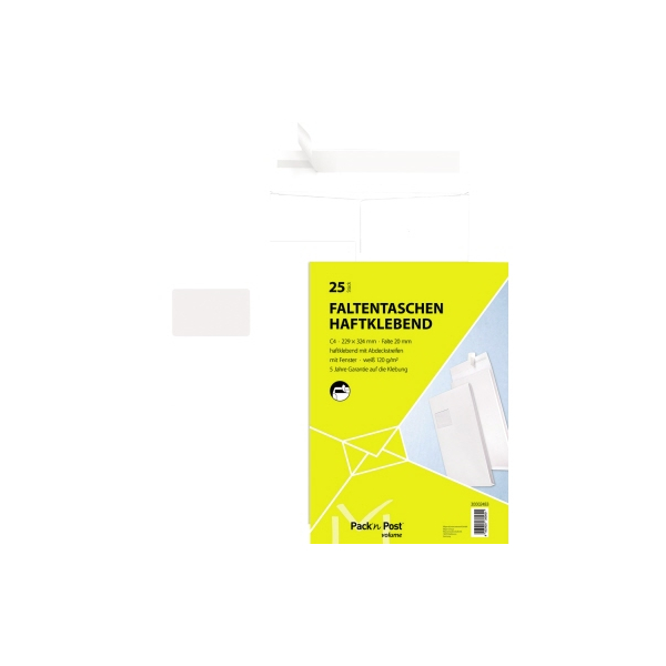 MailMedia Faltentaschen, C4, mit Fenster, haftklebend, 20mm-Falte, 120g, weiß