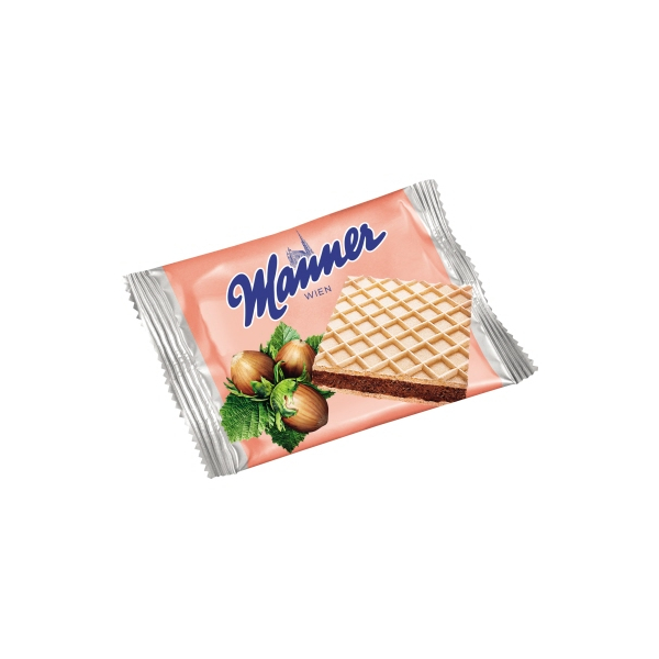 Die zarte Original Manner Waffel, gefüllt mit feiner Haselnusscreme und dem einzigartigen Manner Neapolitaner Geschmack, ist im hochwertigen Manner-Karton verpackt.