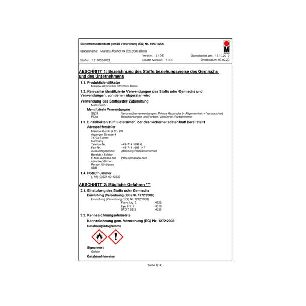 | Marabu GmbH & Co. KG, Asperger Strasse 4, 71732 Tamm Germany | Telefon-Nr. +49-7141/691-0 | Fax-Nr. +49-7141/691-147 | E-Mail: PRSI@marabu.com | |