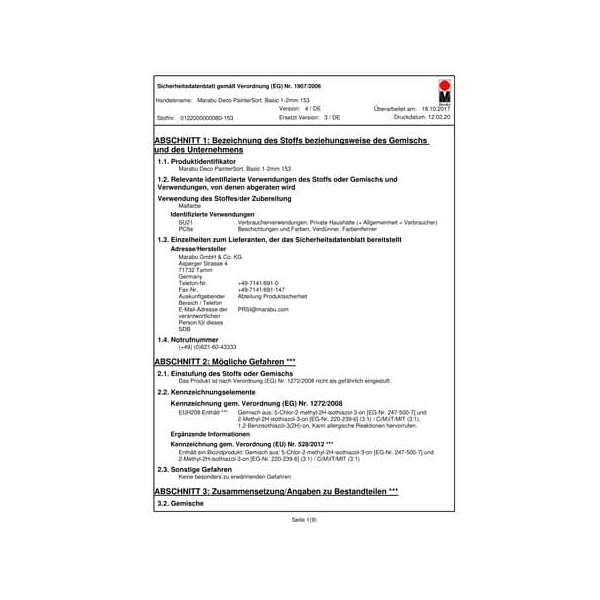 | Marabu GmbH & Co. KG, Asperger Strasse 4, 71732 Tamm, Germany, Telefon-Nr. +49-7141/691-0, Fax-Nr. +49-7141/691-147, Auskunftgebender Bereich: Abteilung Produktsicherheit, E-Mail-Adresse der verantwortlichen Person für dieses SDB: PRSI@marabu.de | |