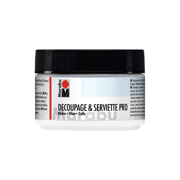Der Decoupagekleber von Marabu ist einfach in der Anwendung und ermöglicht es Ihnen, dünne Papierstücke glatt auf die Oberfläche zu kleben. Er haftet zuverlässig auf verschiedenen Materialien wie Holz, Glas, Keramik und Kunststoff.