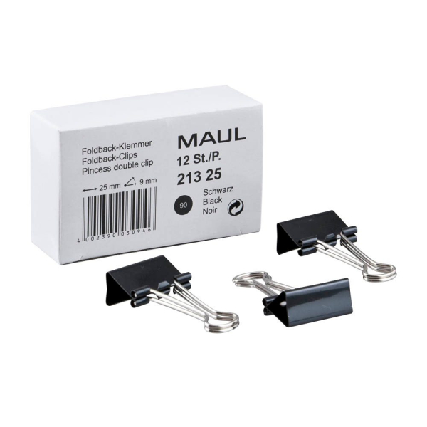 Foldbackklammern Maul 213 25 90 • Klemmbreite: 25mm • Klemmweite: 9mm • Fassungsvermögen: ca. 90 Blatt (80g/m²) • Beschaffenheit: glatt, Flachkopf • Material: Metall • Farbe: schwarz • Stück pro Pack: