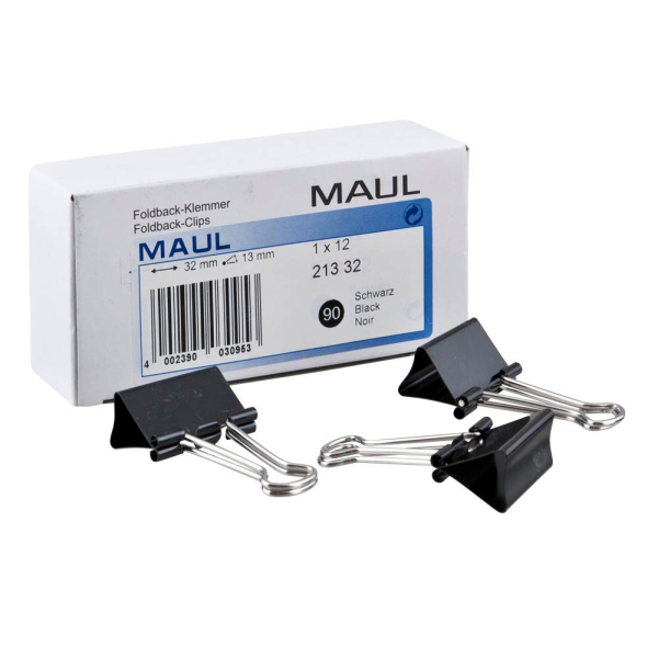 Foldbackklammern Maul 213 32 90 • Klemmbreite: 32mm • Klemmweite: 12mm • Fassungsvermögen: ca. 120 Blatt (80g/m²) • Beschaffenheit: glatt, Flachkopf • Material: Metall • Farbe: schwarz • Stück pro Pack: