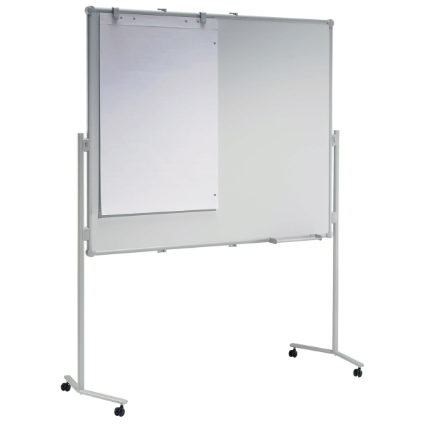 Die 3in1 Kombination: Vorderseite: Pinnboard, Rückseite: Whiteboard + Flipchart