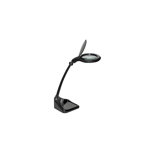Lupe und funktionelle Arbeitsplatzleuchte mit Ablage im Fuß für kleine Utensilien. Gleichmäßige Ausleuchtung durch ringförmig angeordnete LEDs. Ideal für Feinarbeit in Laboren, Werkstätten, technischen Büros, Arztpraxen. Oder im Privatbereich für Briefmarkensammler, Feinmechaniker oder als Leselupe. Leuchtenkopf nach oben/unten neigbar und zur Seite schwenkbar. Beschwerungseinlage und schreibtischschonende Unterlage. Schalter am Leuchtenfuß für bequemes Dimmen, An- und Ausschalten. Leuchte enthält eingebaute LED-Lampen. Die Lampen können nicht ausgetauscht werden. zum Datenblatt