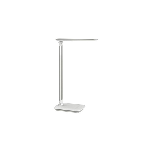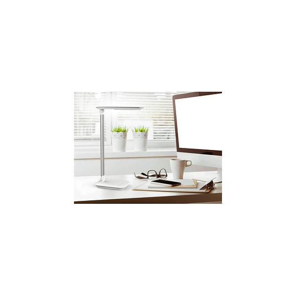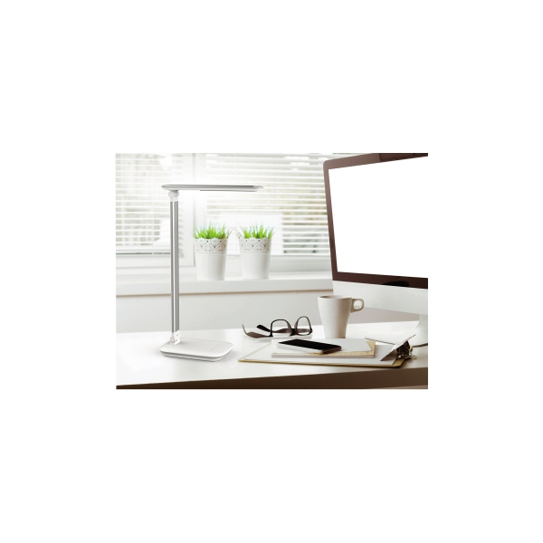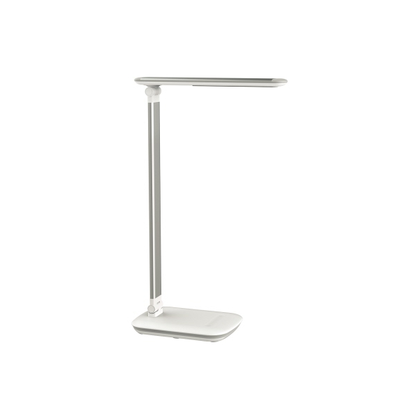 Enthält eingebaute LED-Lampen, Lampen können nicht ausgetauscht werden, ca. 20.000 h Lebensdauer der LEDs, warmweißes Licht. Arm aus eloxiertem Aluminium, 5-Stufen-Dimmer mit Touchfeldbedienung am Leuchtenfuß, Armlänge 36,5 cm, Höhe in normaler Arbeitsstellung 41 cm, Leuchtenkopf 26 x 5 cm, dreh- und neigbar, stabiler Standfuß 18 x 13 cm, mit Beschwerungseinlage und schreibtischschonender Unterlage. Gewichteter Energieverbrauch: 8 kWh/1.000 h. Mit integriertem 5 V, max. 500 mA USB-Anschluss zum Aufladen von z.B. Smartphones.
