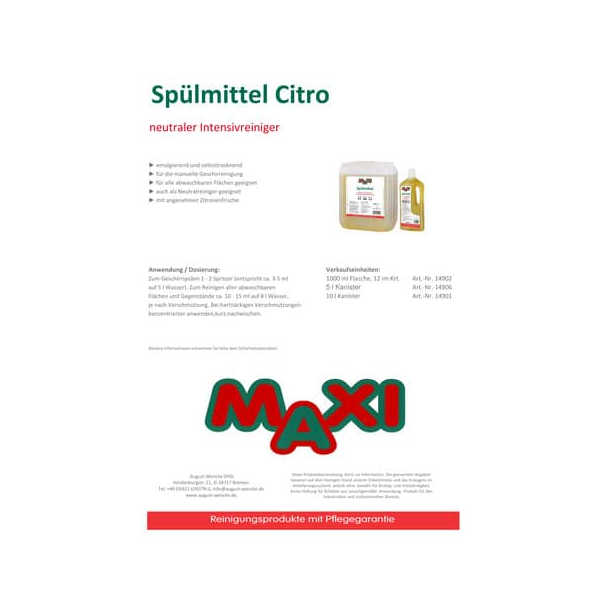 Das Spülmittel Citro 5L wird vom Hersteller MAXI hergestellt, der für qualitativ hochwertige Produkte bekannt ist. Mit seiner langjährigen Erfahrung in der Reinigungsbranche können Sie sich auf die Wirksamkeit und Zuverlässigkeit dieses Spülmittels verlassen.
