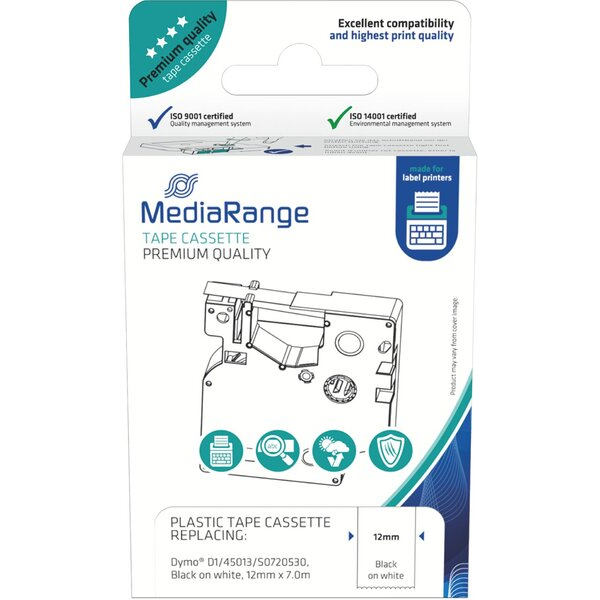 Das Schriftband MRDY45013 von MediaRange ist die ideale Lösung für all Ihre Etikettenanforderungen. Die kompatiblen Schriftbandkassetten bieten eine zuverlässige Qualität, die sich durch eine laminierte Oberfläche auszeichnet und permanent haftend ist.