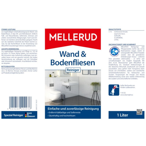 Unser Mellerud Wand- & Bodenfliesen-Reiniger ist ein Spezialreiniger zur regelmäßigen Unterhaltsreinigung Ihrer Wand- und Bodenfliesen im Badezimmer, WC und Wohnbereich. Zuverlässig werden selbst hartnäckige Kalk- und Wasserflecken, Seifenreste, Schmutz und andere unansehnliche Ablagerungen entfernt. Aufgrund der leicht säurehaltigen Spezialrezeptur können Sie selbst leichte Zementschleier von Ihren Wand- und Bodenfliesen mit diesem Produkt entfernen. Zudem wirkt der Mellerud Wand- & Bodenfliesen-Reiniger farbauffrischend, sodass die behandelten Oberflächen ihre natürliche Schönheit und Struktur zurückerlangen. Damit ist dieser hochwirksame Reiniger das ideale Produkt zur mühelosen und gründlichen Reinigung Ihrer Fliesen im Haushalt. Sie können also sicher sein, dass Ihre Fliesenreinigung dank des Mellerud Wand- & Bodenfliesen-Reinigers erheblich effizienter gelingt, als Sie es gewohnt sind, und die behandelten Oberflächen wie neu erstrahlen.