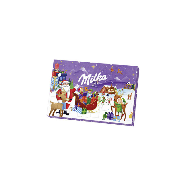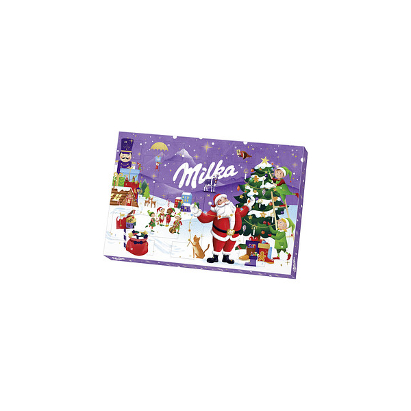 Advent, Advent, ein Lichtlein brennt. Und an diesem Adventskalender warten 24 Türchen, um geöffnet zu werden. Hinter den Türchen befinden sich 24 Schokoladen-Tafel-Überraschungen von Milka. Da freut man sich auf jeden Adventstag und die Wartezeit bis Weihnachten ist nur halb so lang.