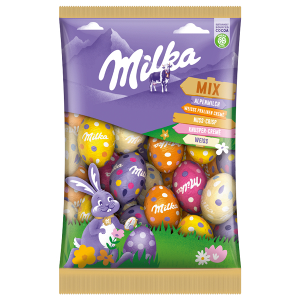 Feiere Ostern mit Milka's Eier Mix! Ein bunter Mix aus köstlicher Osterschokolade in verschiedenen Größen und Formen, die perfekt zum Teilen geeignet sind. Verwöhne dich und deine Liebsten mit dieser schokoladigen Überraschung und bringe etwas Farbe in dein Osterfest.