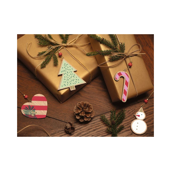 Stimmungsvoller Holzanhänger zum Dekorieren von Weihnachtsbaum, Geschenken oder Fenstern. Liebevoll gestaltet, ca. 8 × 9 × 0,5 cm groß, 4-fach sortiert und im Display erhältlich – ideal für festliche Akzente in der Adventszeit.