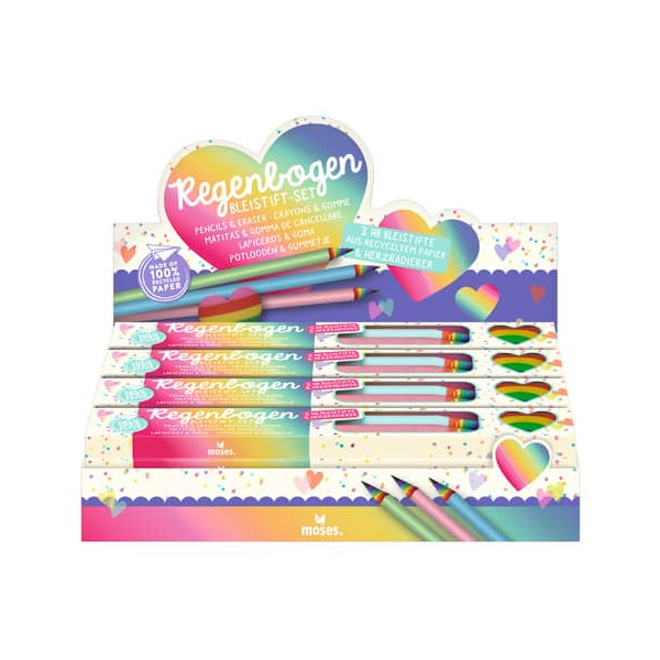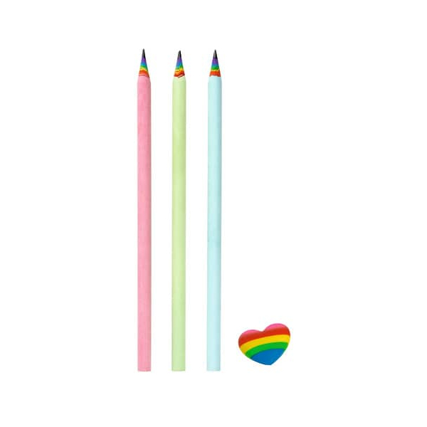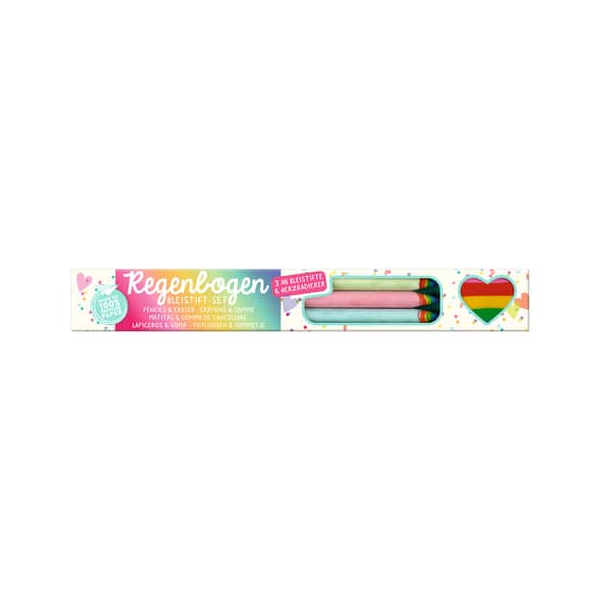 Das Set begeistert mit drei Bleistiften in den ansprechenden Farben Hellblau, Hellgrün und Rosa sowie einem herzförmigen Regenbogenradierer. Mit diesem Radierer lassen sich Fehler beim Schreiben, Zeichnen und Kritzeln im Handumdrehen wegradieren. Das besondere Highlight: Die Bleistifte sind nicht nur schön anzusehen, sondern auch besonders nachhaltig hergestellt, da sie aus recyceltem Papier bestehen. Während der Produktion wird das Papier nach und nach um die Mine gewickelt, was nicht nur umweltfreundlich ist, sondern auch für einen tollen Regenbogen-Look sorgt, sobald die Stifte angespitzt werden.