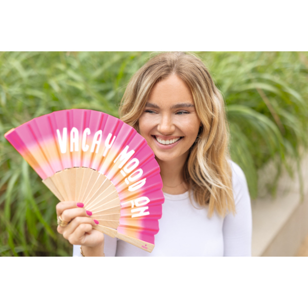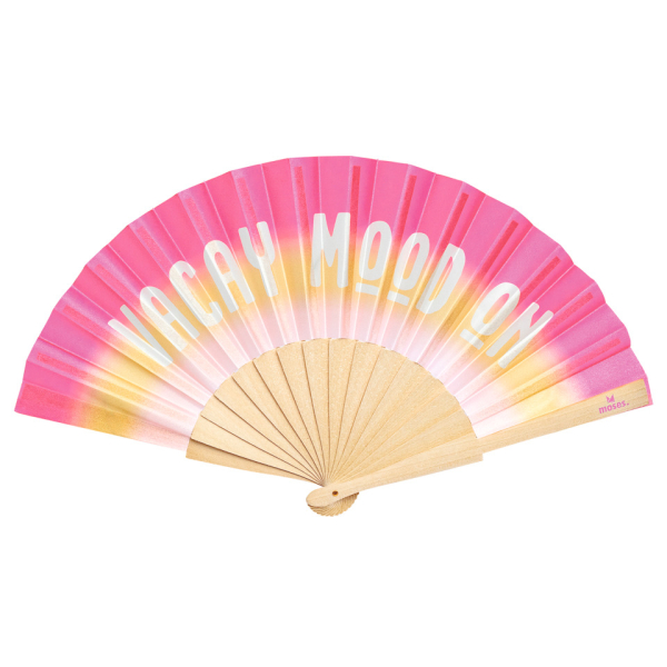 Die Fernweh Fächer bringen an heißen Sommertagen eine erfrischende Brise! Leicht und kompakt passen sie mühelos in jede Handtasche – perfekt für Reisen, Festivals oder den Alltag. Hergestellt aus hochwertigem Holz und Stoff, begeistern sie mit modernen Farbverläufen und coolen Sprüchen wie „Vacay Mood On“, die sofort Urlaubsstimmung verbreiten. Geöffnet messen sie ca. 42 cm x 23 cm x 2,7 cm. 3-fach sortiert, im Display.