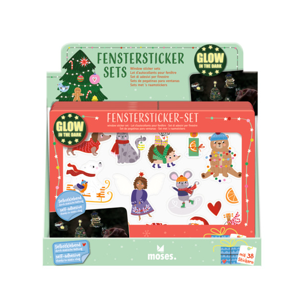 Was gibt es Schöneres, als an Weihnachten kreativ zu werden und sich auf die Festtage einzustimmen? Das nachtleuchtende Fenstersticker-Set von Moses hilft dabei und bietet gleich 2 Bögen mit insgesamt 38 weihnachtlichen, bunten Fensterbilder. Ob Rentier, Engel, Weihnachtsmann oder Christbaumkugeln: Das Set beinhaltet ein ganzes Winterwunderland. Besonderes Highlight: Die Sterne- und Schneeflockensticker leuchten im Dunkeln!