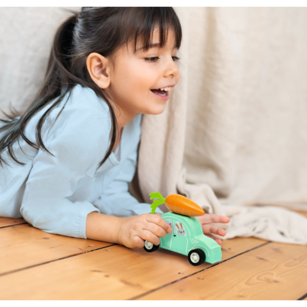 Voller Fahrt voraus - mit Möhrenpower durch den Frühling! Dieser liebevoll gestaltete Holz-Flitzer bringt Bewegung ins Spiel. Einfach zurückziehen, loslassen und schon saust das kleine Fahrzeug mit Rückziehmotor über den Boden. Die fröhlichen Frühlingsmotive und die große Möhre auf dem Dach sorgen für gute Laune bei kleinen Entdecker*innen. Holzauto mit Rückziehmotor - robust verarbeitet, ideal für kleine Kinderhände - fördert motorische Fähigkeiten und Spielspaß. In zwei fröhlichen Farbdesigns erhältlich. Für Kinder ab 12 Monaten.