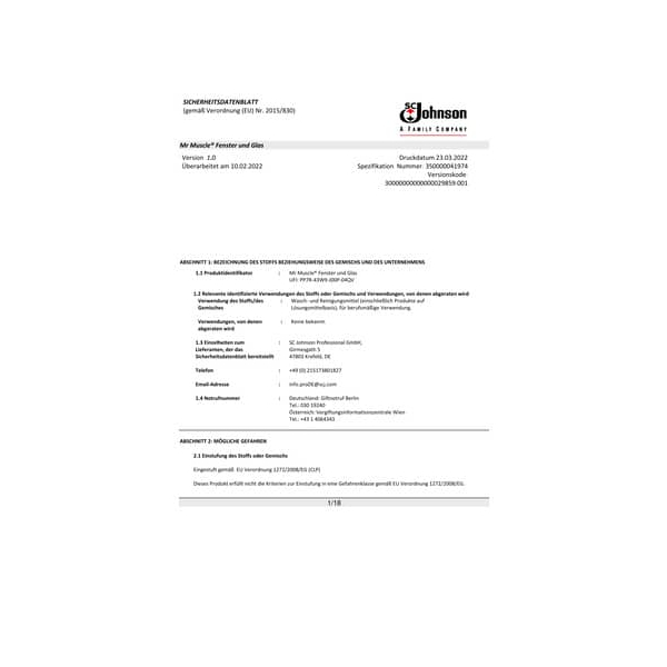 Der Glasreiniger 316533 kommt in einer praktischen Sprühflasche aus 100 % recyceltem Kunststoff und ist in flüssiger Form erhältlich. Er ist kein Biozid-Produkt und somit umweltfreundlich. Die Adresse des EU-Repräsentanten ist Girmesgath 5, 47803 Krefeld, Deutschland. Für weitere Informationen besuchen Sie bitte www.scjp.com.