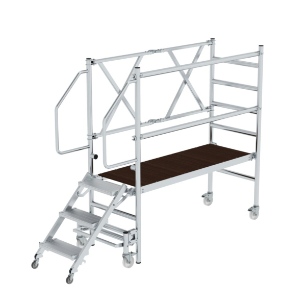 Dank der leicht bedienbaren Hubrollen können Sie das Gerüst problemlos von Ort zu Ort bewegen. Für maximale Arbeitssicherheit sind beidseitige Handläufe, ein Plattformgeländer und eine Knieleiste integriert. Das Gerüst ist im aufgebauten Zustand türengängig und lässt sich platzsparend transportieren und lagern, da es als Transportwagen nutzbar ist. Die trittsichere Plattform sorgt für einen festen Stand, und die flexiblen Einsatzmöglichkeiten bieten drei verschiedene Einhängehöhen.